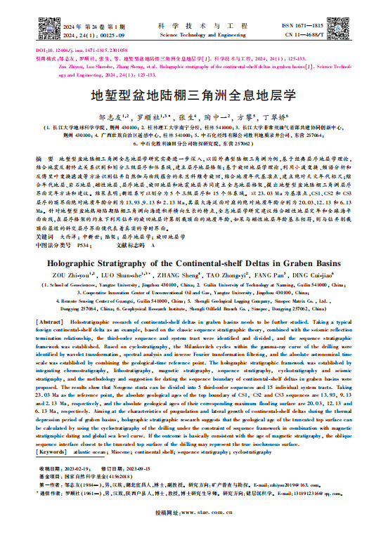 太阳成tyc33455ccwww邹志友博士联合研究团队,在《科学技术与工程》期刊上发表了题为“地堑型盆地陆棚三角洲全息地层学”的研究文章。该研究聚焦于地堑型盆地陆棚三角洲的全息地层学特征,主要研究内容及成果如下: