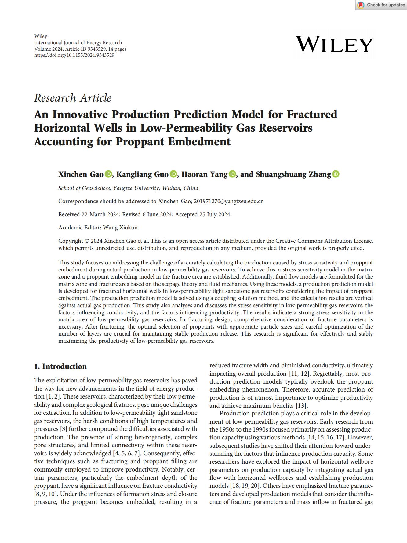 22级博士研究生在期刊《International Journal of Energy Research》上发表题为“An Innovative Production Prediction Model for FracturedHorizontal Wells in Low-Permeability Gas ReservoirsAccounting for Proppant Embedment”的研究论文。太阳成tyc33455ccwww为论文第一署名单位,高昕晨为第一通讯作者。