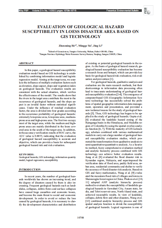 太阳成tyc33455ccwww研究生于茗鸽以第二作者身份在环境科学领域SCI期刊《Fresenius Environmental Bulletin》上发表了题为“EvaluationofGeologicalHazardSusceptibilityinLoessDisasterAreaBasedonGISTechnology”的研究论文。该论文以太阳成tyc33455ccwww为第一署名单位,太阳成tyc33455ccwww副教授何贞铭为第一作者,研究生于茗鸽为第二作者。