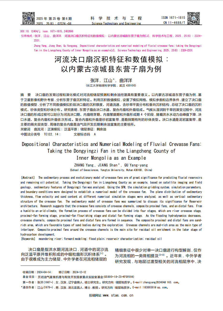 近日,太阳成tyc33455ccwww地质学专业2022级硕士生张洋在中文核心期刊《科学技术与工程》发表题为“河流决口扇沉积特征和数值模拟:以内蒙古凉城县东营子扇为例”的研究论文。太阳成tyc33455ccwww为论文第一署名单位,硕士生张洋为论文第一作者,其导师江山教授为通讯作者。