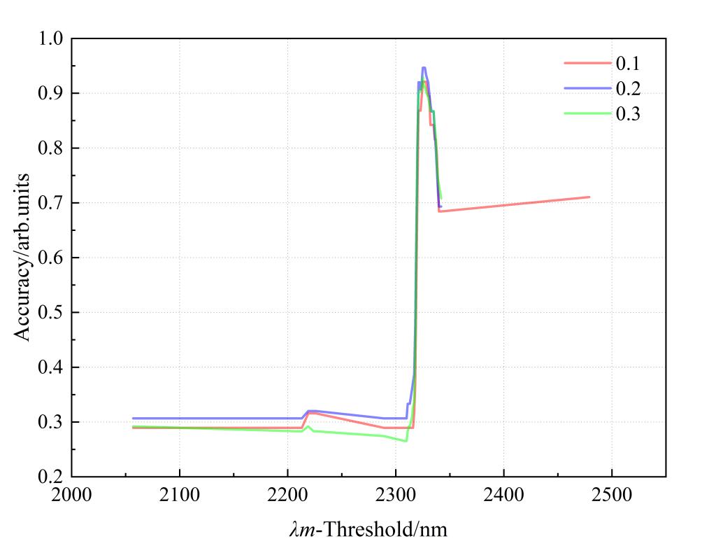 图1不同特征在不同测试集下的分类准确率。(a)吸收谷最低点波长;(b)吸收带右肩波长;(c)吸收带宽度