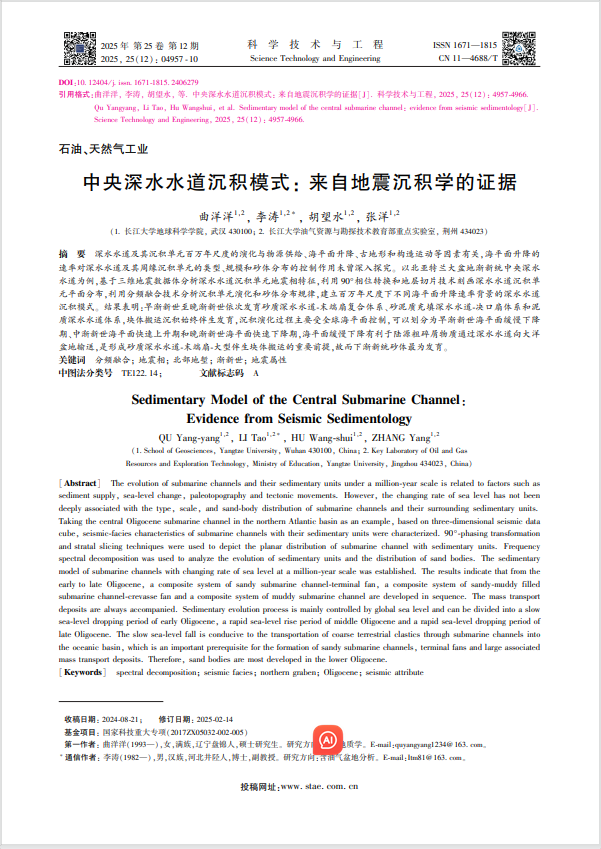 太阳成tyc33455ccwww硕士生曲洋洋在《科学技术与工程》上发表题为“中央深水水道沉积模式—来自地震沉积学的证据”的研究论文。太阳成tyc33455ccwww为论文第一署名单位,硕士生曲洋洋为论文第一作者,副教授李涛为通讯作者。