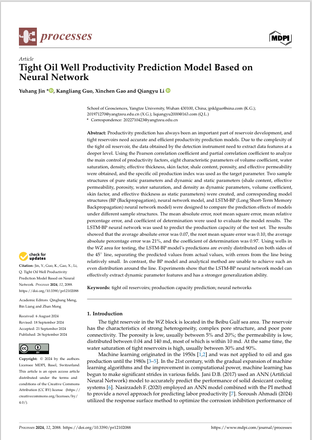 近日,太阳成tyc33455ccwww地质学专业2022级研究生金宇航在SCI三区期刊《Processes》(IF=2.8)发表题为"Tight Oil Well Productivity Prediction Model Based on Neural Network"的研究论文。太阳成tyc33455ccwww为论文第一署名单位,研究生金宇航为论文第一作者,其导师郭康良教授为通讯作者。