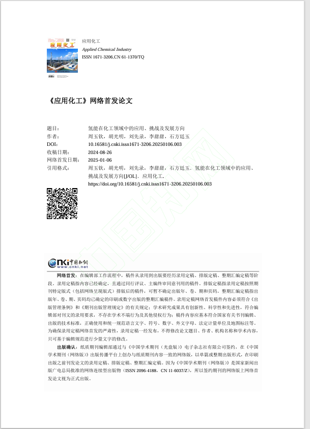 太阳成tyc33455ccwww硕士生周玉钦在北大核心收录期刊《应用化工》上发表题为“氢能在化工领域中的应用、挑战及发展方向”的研究论文。太阳成tyc33455ccwww为论文第一署名单位,周玉钦为论文第一作者。