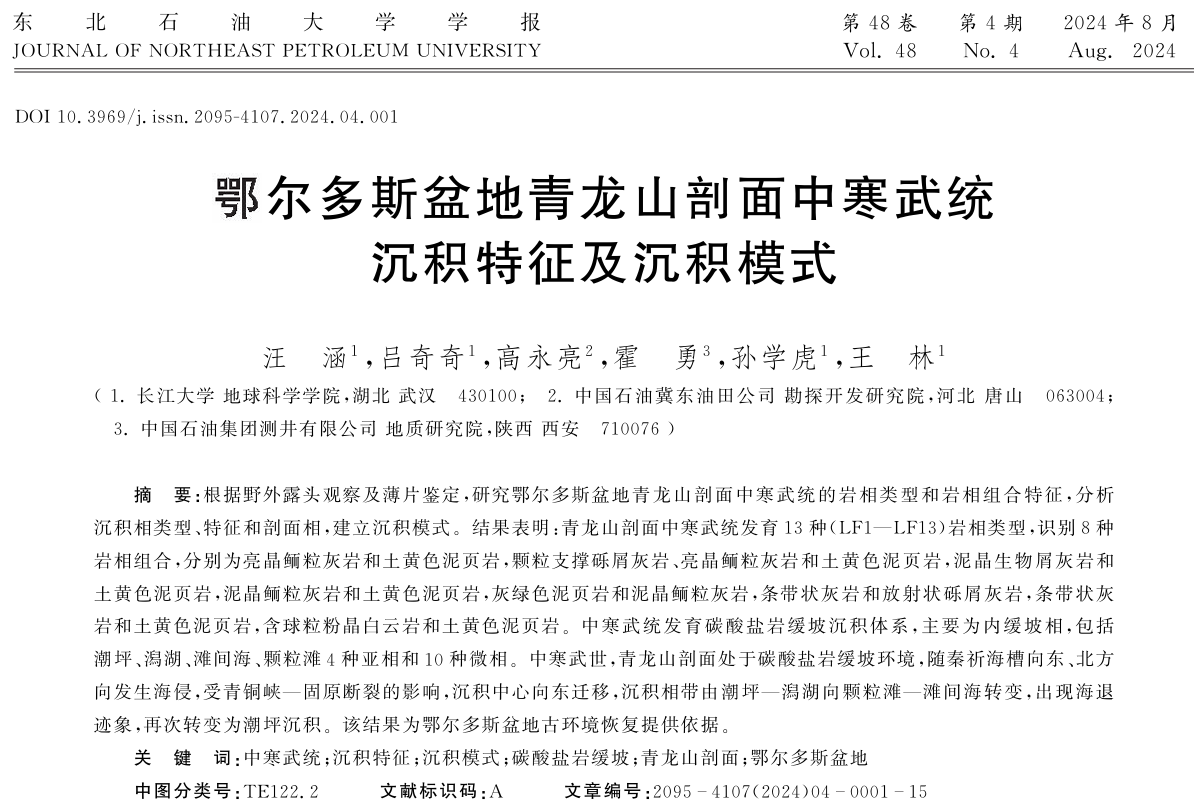 2024年8月15日,22级硕士研究生汪涵在《东北石油大学学报》上发表题为“鄂尔多斯盆地青龙山剖面中寒武统沉积特征及沉积模式”的研究论文,太阳成tyc33455ccwww为论文第一署名单位,硕士研究生汪涵为论文第一作者,其导师吕奇奇副教授为该文通讯作者。