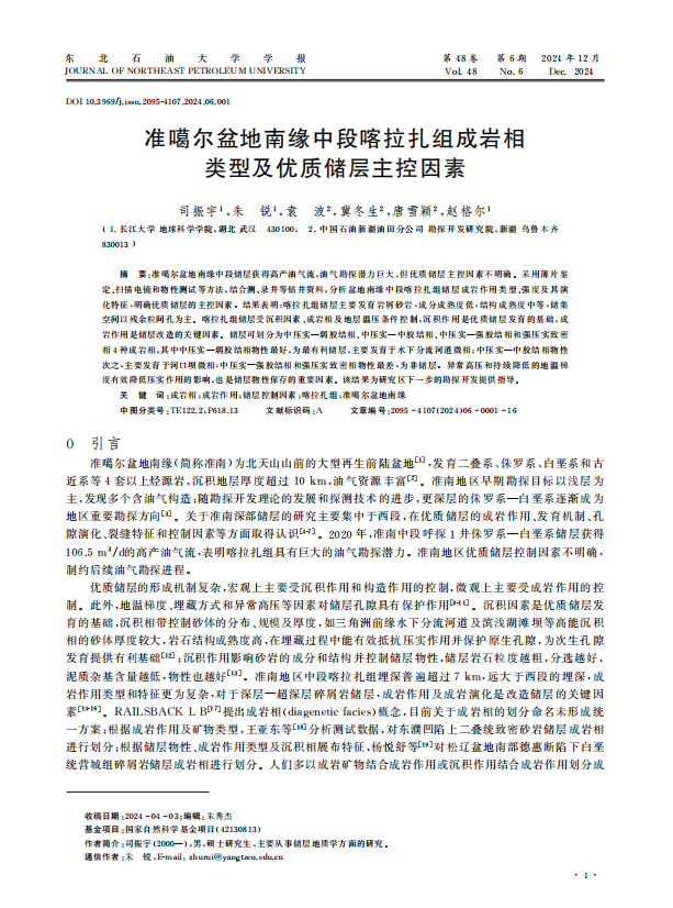 太阳成tyc33455ccwww研究生司振宇以第一作者身份在北大核心期刊《东北石油大学学报》上发表题为“准噶尔盆地南缘中段喀拉扎组成岩相类型及优质储层主控因素”的研究论文,太阳成tyc33455ccwww为论文第一署名单位。研究生司振宇为第一作者,副教授朱锐为论文通讯作者。