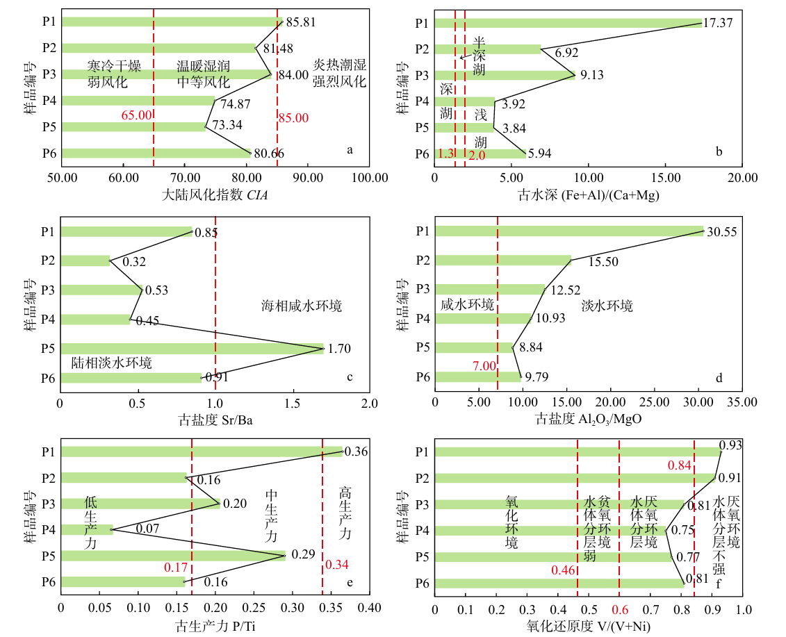 结果表明研究区油页岩含油率为3.8%~6.7%,灰分质量分数为44.81%~75.58%,全硫为0.31%~2.29%,发热量平均值为11.95kJ/g;测井曲线呈现高伽马、高电阻率和负异常自然电位特征,明显区别于煤层和泥岩;有机质类型主要以Ⅱ2型为主,有机质丰度较高,整体处于未熟−低成熟阶段;总体属于中品质、硅质灰分、特低硫的油页岩。主量元素以SiO2和Al2O3为主,质量分数分别为48.26%(平均值)和17.57%(平均值),微量元素Sr、Th和U富集,Ni、V和Ba亏损,元素分析表明研究区有较多含钾矿物和镁铁成分,且稳定组分较高。通过古环境元素标志和饱和烃色谱分析认为有机质主要来源于混合有机质,古生产力中等,且沉积环境具有独特性,属于温暖湿润的贫氧陆相淡水洼地环境。分析各环境因素显示,氧化还原条件为有机质富集主要影响因素,进而建立了不同沉积时期的延安组油页岩沉积演化模式。研究成果为鄂尔多斯盆地西南缘侏罗系延安组油页岩勘探开发提供了重要理论指导和技术支撑。