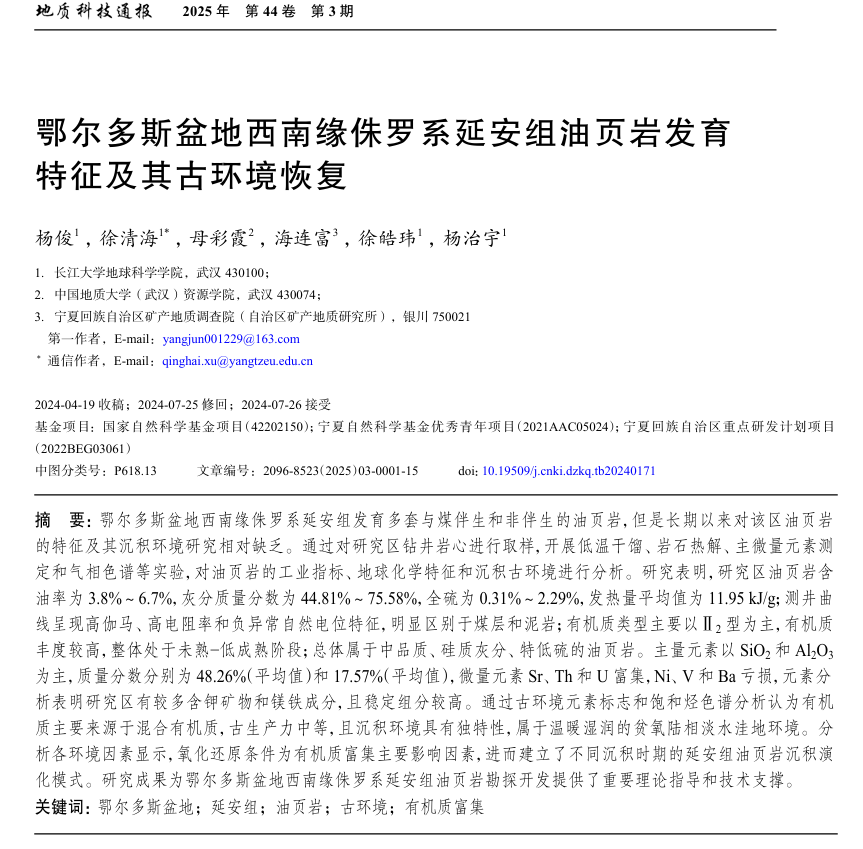 太阳成tyc33455ccwww硕士生杨俊在期刊《地质科技通报》上发表题为“鄂尔多斯盆地西南缘侏罗系延安组油页岩发育特征及其古环境恢复”的研究论文。太阳成tyc33455ccwww为论文第一署名单位,徐清海副教授为通讯作者。
