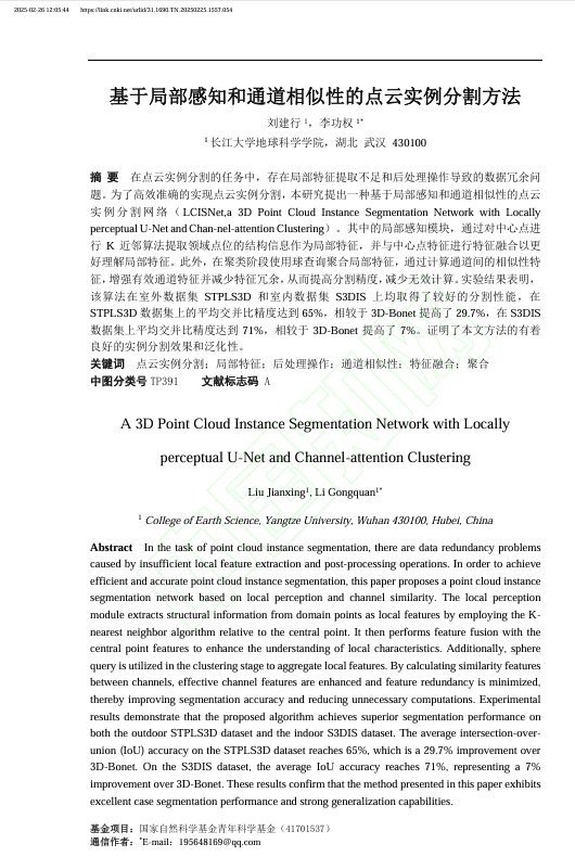 太阳成tyc33455ccwww硕士生刘建行在《激光与光电子学进展》发表题为“基于局部感知和通道相似性的点云实例分割方法”的研究论文。太阳成tyc33455ccwww为论文第一署名单位,硕士生刘建行为第一作者,教授李功权为论文通讯作者。