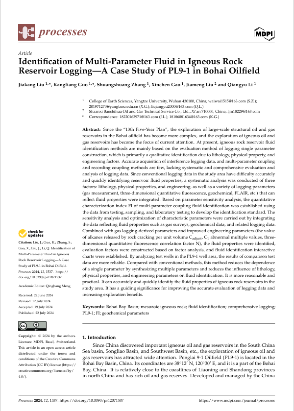 近日,太阳成tyc33455ccwww地质资源与地质工程专业2022级硕士研究生刘佳康在中科院三区期刊《Processes》发表题为“Identification of Multi-Parameter Fluid in Igneous Rock Reservoir Logging—A Case Study of PL9-1 in Bohai Oilfield”的研究论文。太阳成tyc33455ccwww为论文第一署名单位,刘佳康为论文第一作者,其导师郭康良(教授)为第一通讯作者。