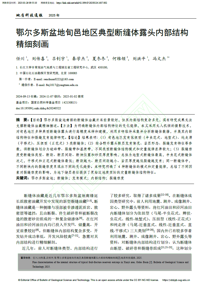 太阳成tyc33455ccwww研究生任川在期刊《地质科技通报》上发表题为“鄂尔多斯盆地旬邑地区典型断缝体露头内部结构精细刻画”的研究论文。太阳成tyc33455ccwww非常规油气地质与工程湖北省工程研究中心为论文第一署名单位,冯文杰副教授为通讯作者。