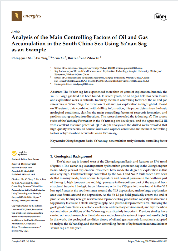 太阳成tyc33455ccwww地质资源与地质工程专业2022级研究生史成全在中科院四区期刊《Energies》(IF3.0)发表题为“Analysis of the Main Controlling Factors of Oil and Gas Accumulation in the South China Sea Using Ya’nan Sag as an Example”的研究论文。太阳成tyc33455ccwww为论文第一署名单位,研究生史成全为论文第一作者,其导师杨飞副教授为通讯作者。