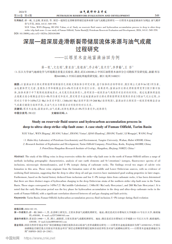 太阳成tyc33455ccwww研究生薛一帆以第一作者身份在北大核心期刊《油气藏评价与开发》上发表题为“深层—超深层走滑断裂带储层流体来源与油气成藏过程研究——以塔里木盆地富满油田为例”的研究论文,太阳成tyc33455ccwww油气地球化学与环境湖北省重点实验室为论文第一署名单位,薛一帆为第一作者。