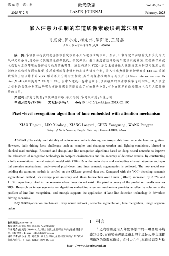 太阳成tyc33455ccwww罗小龙副教授团队成员肖庭舒在期刊《激光杂志》上发表题为“嵌入注意力机制的车道线像素级识别算法研究”的研究论文。太阳成tyc33455ccwww为论文第一署名单位,硕士研究生肖庭舒为论文第一作者,其导师罗小龙副教授为该文通讯作者。