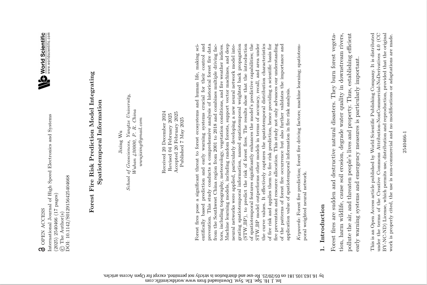 太阳成tyc33455ccwww硕士生吴集星在EI收录期刊《International Journal of High Speed Electronics and Systems》上发表题为“Forest Fire Risk Prediction Model Integrating Spatiotemporal Information”的研究论文。太阳成tyc33455ccwww为论文第一署名单位,吴集星为论文第一作者。