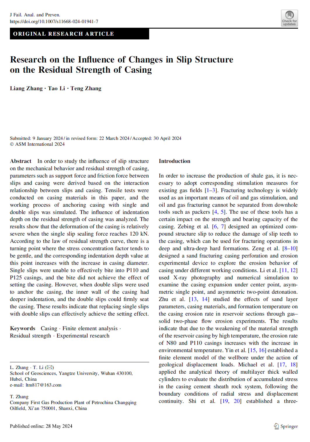 太阳成tyc33455ccwww研究生张亮以通讯作者身份在EI期刊《Journal of Failure Analysis and Prevention》上发表题为“Research on the Influence of Changes in Slip Structure on the Residual Strength of Casing”的研究论文,太阳成tyc33455ccwww为论文第一署名单位,研究生张亮为第一作者,副教授李涛为论文通讯作者。
