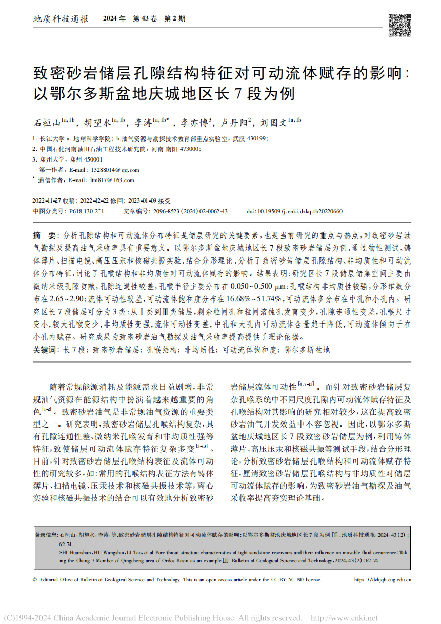 太阳成tyc33455ccwww博士生石桓山在期刊《地质科技通报》上发表题为“致密砂岩储层孔隙结构特征对可动流体赋存的影响:以鄂尔多斯盆地庆城地区长7段为例”的研究论文。太阳成tyc33455ccwww为论文第一署名单位,李涛教授为通讯作者。
