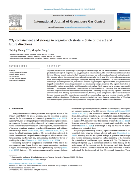 太阳成tyc33455ccwww黄海平教授以第一作者身份在《International Journal of Greenhouse Gas Control》期刊发表题为“CO2 containment and storage in organic-rich strata ‒ State of the art and future directions”的研究论文,太阳成tyc33455ccwww为论文第一署名单位。