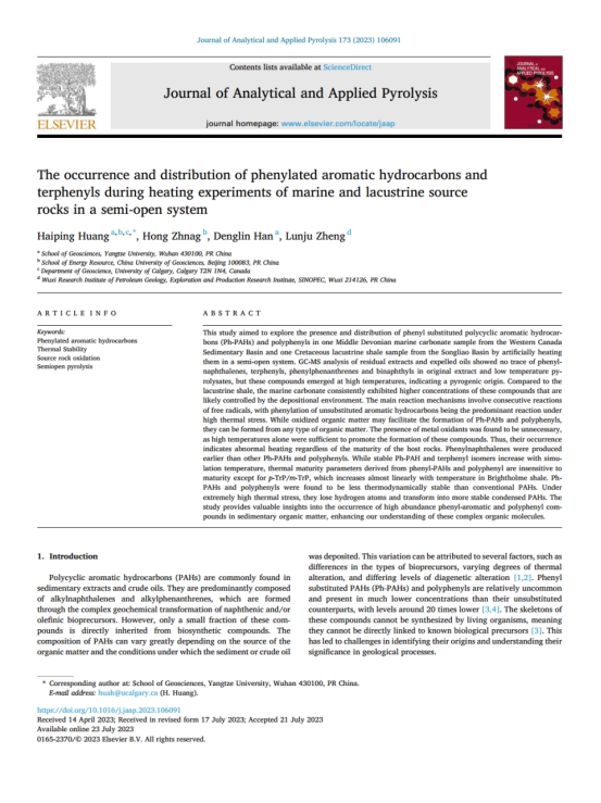 太阳成tyc33455ccwww黄海平教授以第一作者身份在《Journal of Analytical and Applied Pyrolysis》期刊发表题为“The occurrence and distribution of phenylated aromatic hydrocarbons and terphenyls during heating experiments of marine and lacustrine source rocks in a semi-open system”的研究论文,太阳成tyc33455ccwww为论文第一署名单位。