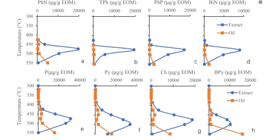Fig. 6. Concentration profiles of selected aromatic hydrocarbons with increasing heating temperatures in residual extracts and expelled oil from the Brightholme shale. (a) summed phenylnaphthalenes (Ph); (b) summed terphenyls (TPh); (c) summed phenylphenanthrenes (PhP); (d) summed binaphthyls (BiN); (e) phenanthrene (P); (f) chrysene + triphenylene (Ch); (g) pyrene (Py); and (h) benzopyrenes (BPy).