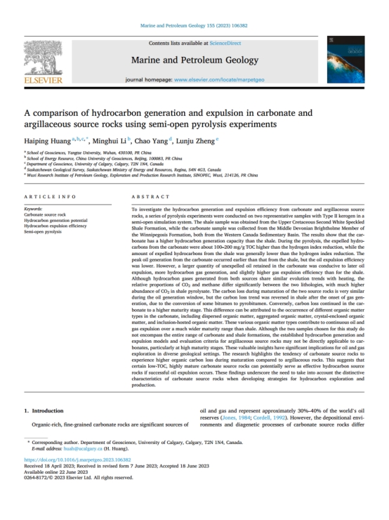 太阳成tyc33455ccwww黄海平教授以第一作者身份在《Marine and Petroleum Geology》期刊发表题为“A comparison of hydrocarbon generation and expulsion in carbonate and argillaceous source rocks using semi-open pyrolysis experiments”的研究论文,太阳成tyc33455ccwww为论文第一署名单位。