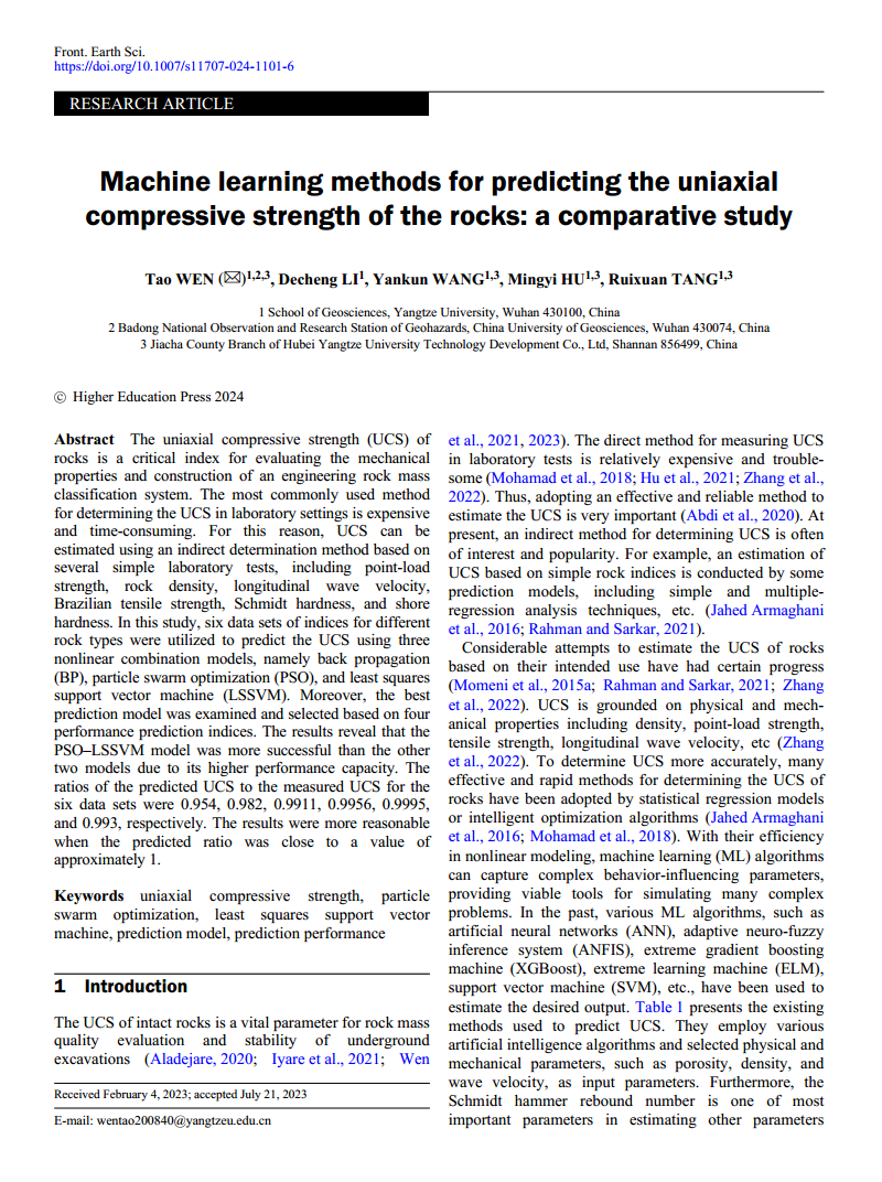 太阳成tyc33455ccwww温韬教授以第一作者身份在《Frontiers of Earth Science》上发表题为“Machine learning methods for predicting the uniaxial compressive strength of the rocks: a comparative study”的研究论文。太阳成tyc33455ccwww为论文第一署名单位。