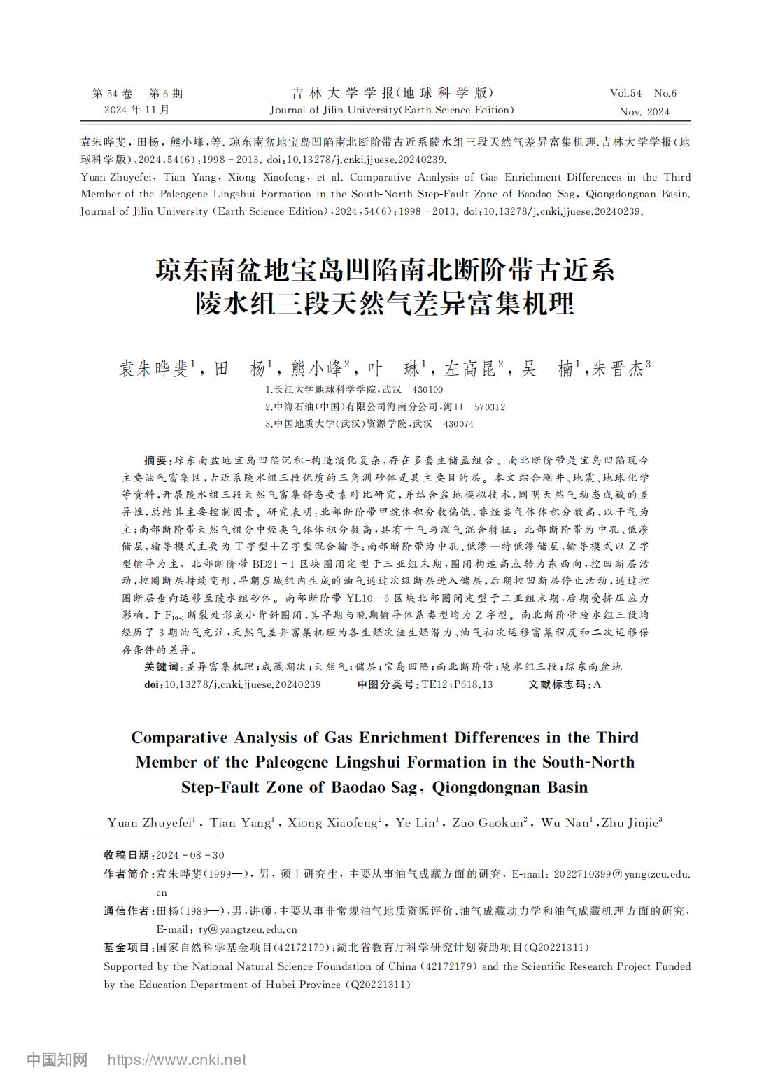 太阳成tyc33455ccwww地质学研究生袁朱晔斐在《吉林大学学报》上发表了题为“琼东南盆地宝岛凹陷南北断阶带古近系 陵水组三段天然气差异富集机理”的研究论文。太阳成tyc33455ccwww为论文第一署名单位,硕士生袁朱斐晔为论文第一作者,教师田杨为通讯作者。