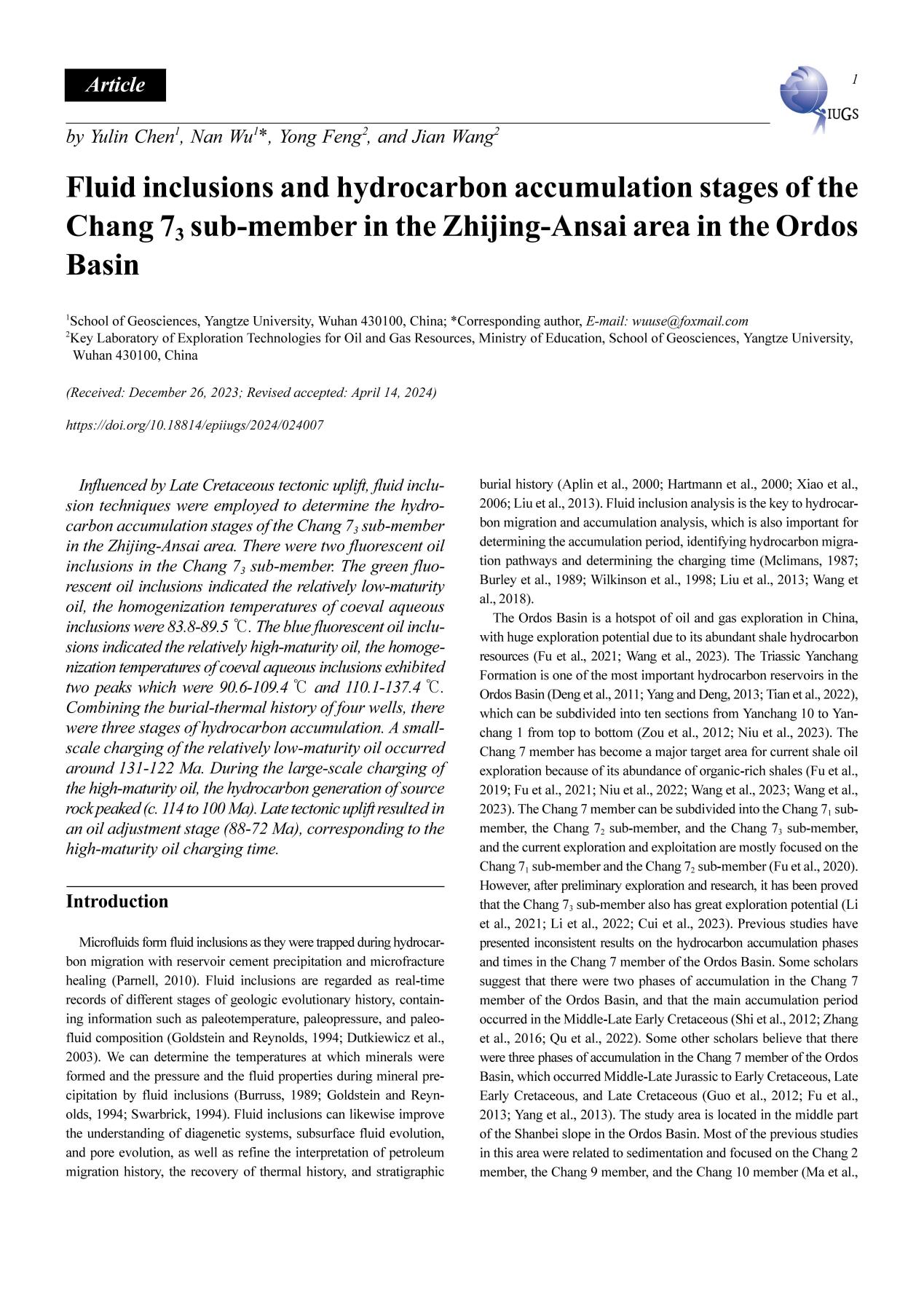 太阳成tyc33455ccwww硕士生陈雨霖在《EPISODES》上发表题为“Fluid inclusions and hydrocarbon accumulation stages of the Chang 73 sub-member in the Zhijing-Ansai area in the Ordos Basin”的研究论文。太阳成tyc33455ccwww为论文第一署名单位,硕士生陈雨霖为论文第一作者,教师吴楠为通讯作者。