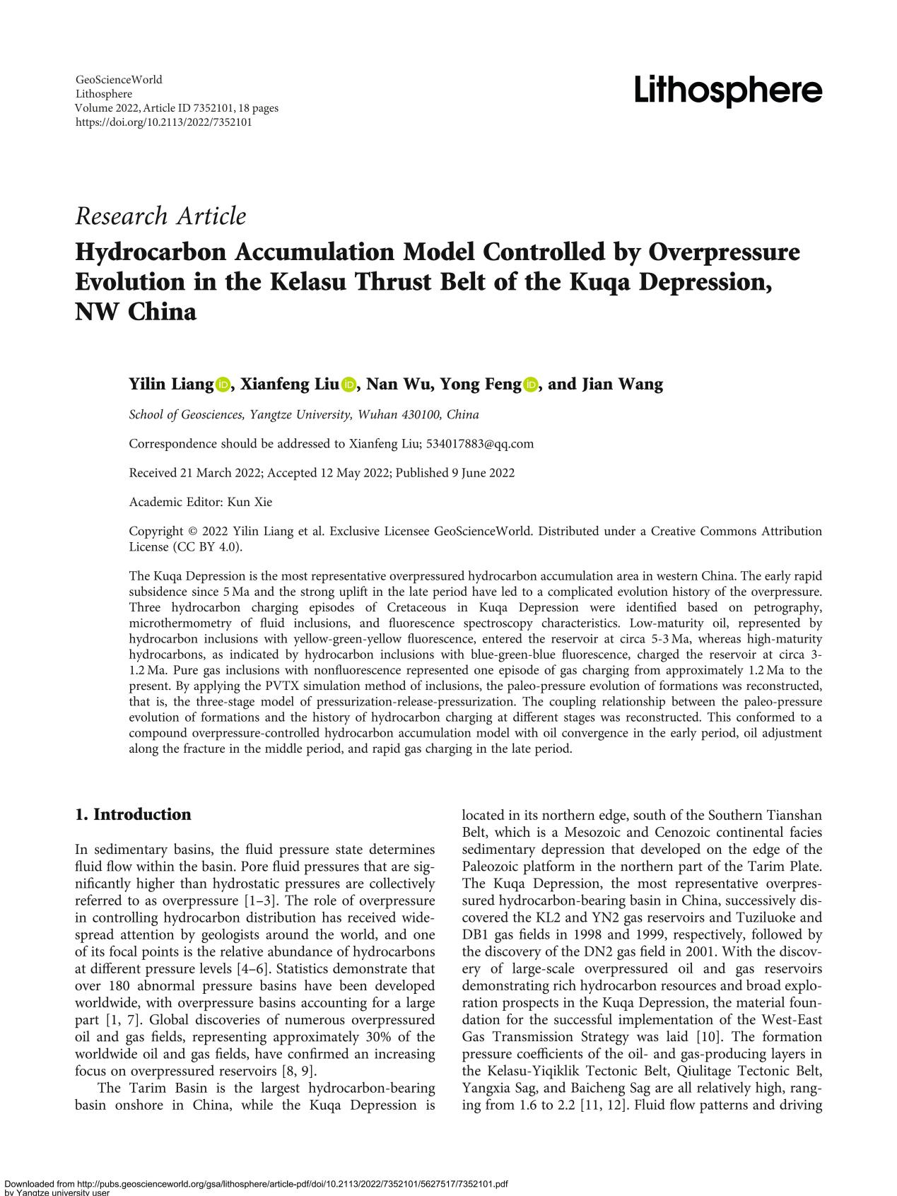 太阳成tyc33455ccwww博士生梁祎琳在《LITHOSPHERE》上发表题为“Hydrocarbon Accumulation Model Controlled by Overpressure Evolution in the Kelasu Thrust Belt of the Kuqa Depression, NW China”的研究论文。太阳成tyc33455ccwww为论文第一署名单位,博士生梁祎琳为论文第一作者,教师刘显凤为通讯作者。