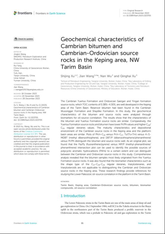 太阳成tyc33455ccwww王健在《Frontiers in Earth Science》发表题为“Geochemical characteristics of Cambrian bitumen and Cambrian-Ordovician source rocks in the Keping area, NW Tarim Basin”的研究论文。太阳成tyc33455ccwww为论文第一署名单位,教师王健为通讯作者。