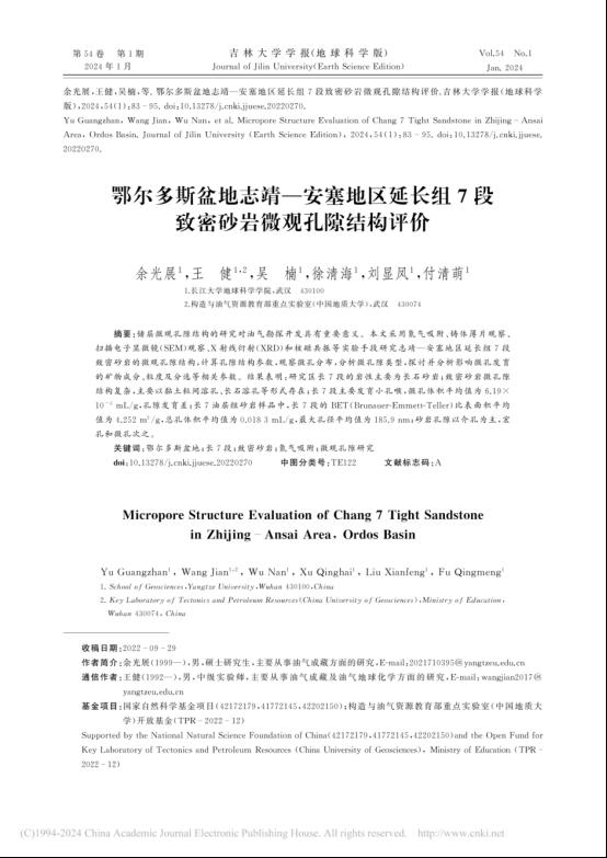 太阳成tyc33455ccwww硕士生余光展在《吉林大学学报(地球科学版)》上发表题为“鄂尔多斯盆地志靖—安塞地区延长组7段致密砂岩微观孔隙结构评价”的研究论文。太阳成tyc33455ccwww为论文第一署名单位,硕士生余光展为论文第一作者,教师王健为通讯作者。