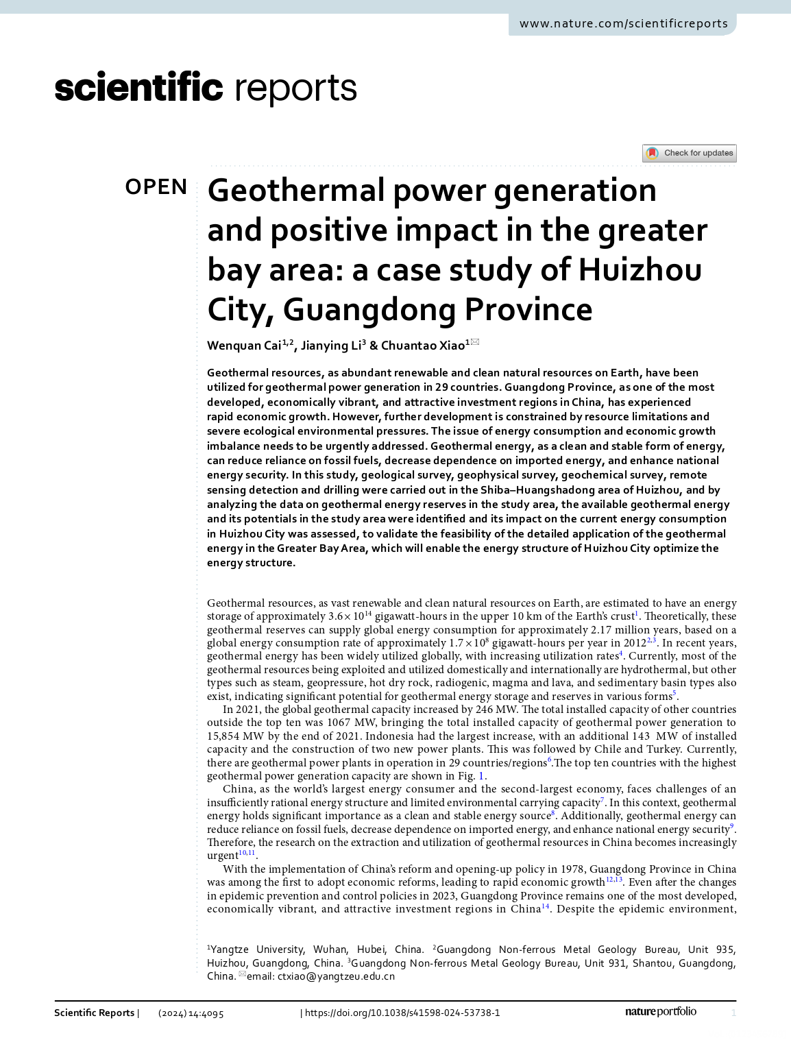 太阳成tyc33455ccwww地质学专业硕士生蔡文权在国际综合类科技期刊《Scientific Reports》上发表题为“Geothermal power generation and positive impact in the greater bay area: a case study of Huizhou City, Guangdong Province”的研究论文。太阳成tyc33455ccwww为论文第一署名单位,硕士研究生蔡文权为论文第一作者,其导师肖传桃教授为该文通讯作者。