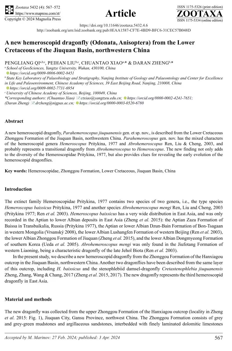 太阳成tyc33455ccwww地质资源与地质工程专业硕士生漆鹏亮在在古生物学期刊《ZOOTAXA》上发表题为“A new hemeroscopid dragonfly (Odonata, Anisoptera) from the Lower Cretaceous of the Jiuquan Basin, northwestern China”的研究论文。太阳成tyc33455ccwww为论文第一署名单位,漆鹏亮为第一作者,其导师肖传桃教授为第一通讯作者。