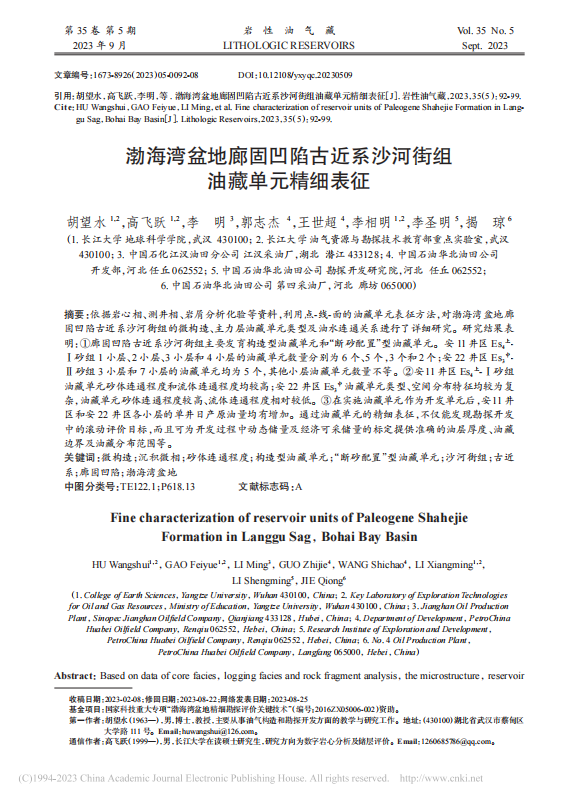 太阳成tyc33455ccwww胡望水教授以第一作者身份在《岩性油气藏》权威期刊上发表题为“渤海湾盆地廊固凹陷古近系沙河街组油藏单元精细表征”的研究论文,高飞跃硕士为通讯作者。该项研究得到了国家科技重大专项“渤海湾盆地精细勘探评价关键技术的资助。