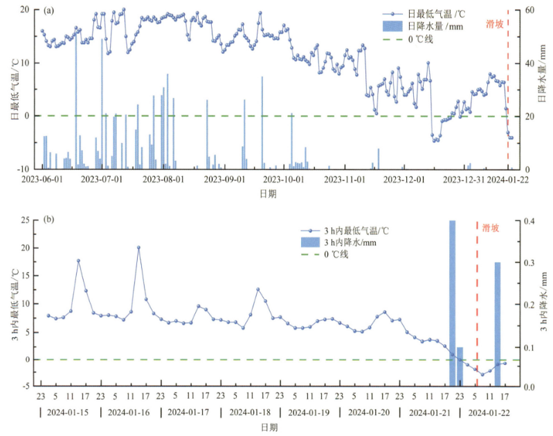 本研究在现场调查的基础上确定滑坡发育的特点,基于无人机航测和实地测量确定滑坡体积与堆积面积。通过堆积岩块的新鲜面和风化面分析确定岩石节理发育和风化松动特征;通过附近出露岩体的产状和节理特征的测量,进一步确定滑坡源区的岩体特征。基于近年的区域降水过程和岩性分析滑坡赋水的特征,以及岩石冻胀力学和滑坡发生前的气温变化,结合岩体组构,分析冻胀引发滑坡的可能性及其机制。