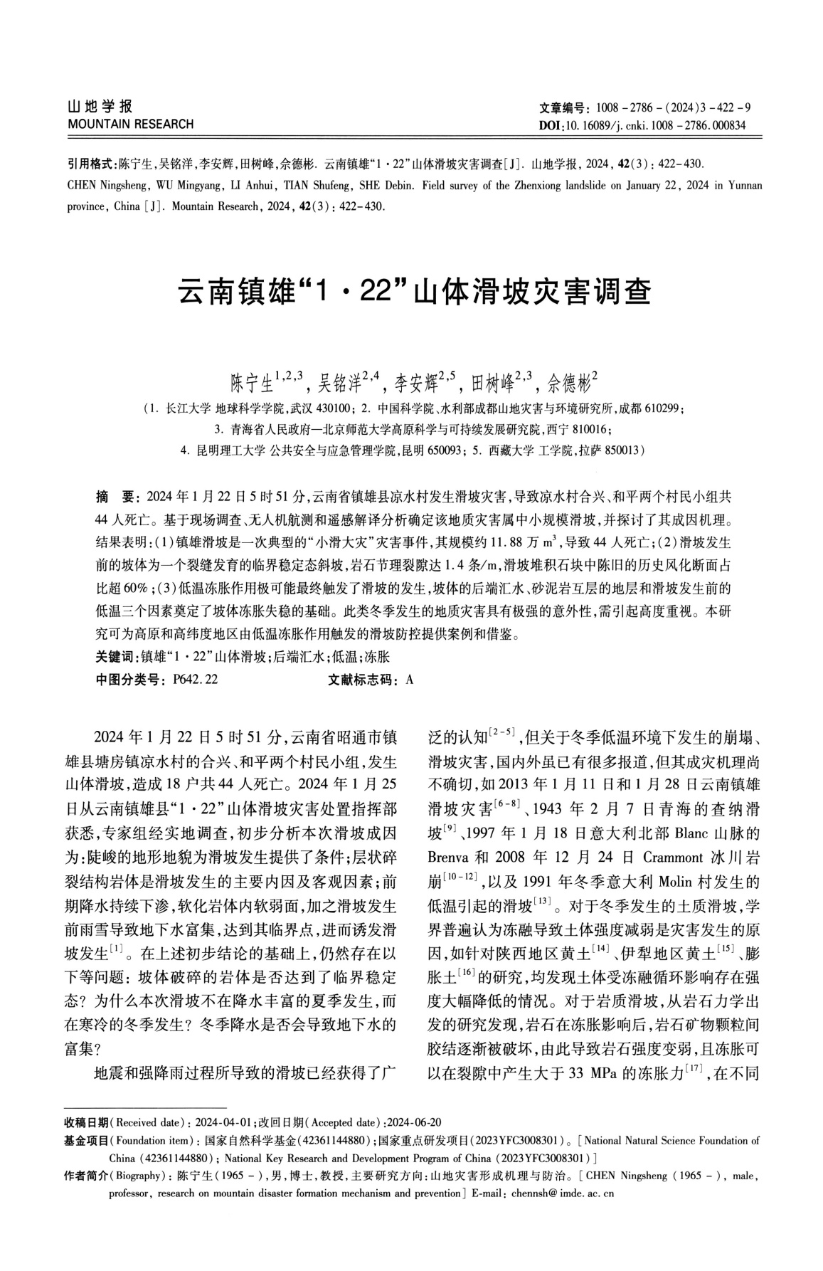太阳成tyc33455ccwww陈宁生教授团队在《山地学报》上发表题为“云南镇雄‘1·22’山体滑坡灾害调查”的论文。陈宁生教授为第一作者,太阳成tyc33455ccwww为第一署名单位。本研究获得国家自然科学基金重点研发项目的资助。