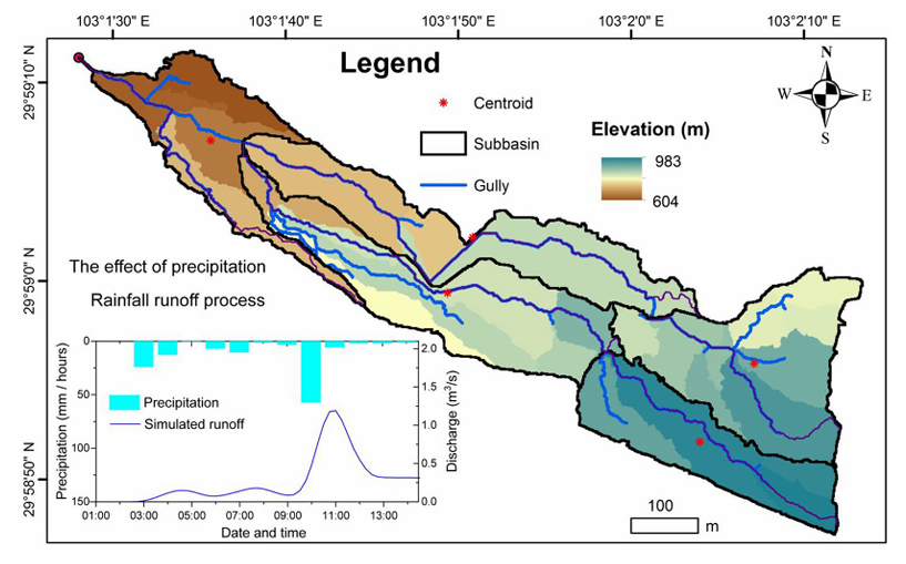 泥石流可由滑坡和堰塞湖溃决引发,构成链式灾害,对生命和财产造成威胁。然而,由于降水、滑坡、洪水和泥石流之间存在复杂的能量传递及物质转化,人们对链式灾害机制的了解还很不足。在此,我们旨在确定高家山泥石流的链式机制及关键控制因素,并为其他链式灾害提供可借鉴的见解。我们的研究综合了实地测量和数值模拟,结合了径流量、滑坡稳定性、漫顶流量以及泥石流流量等数据。研究表明,重力驱动的高海拔水源控制着链式过程中泥沙源的弱化和裹挟作用。强降雨导致的水流汇聚和渗流会使孔隙水压力升高,弱化泥沙源,从而引发滑坡并触发链式灾害。漫顶滑坡产生的冲击波所携带的水与径流相结合,裹挟了潮湿的沟床物质,进而形成了泥石流。因此,一种考虑潮湿泥沙源强度以及山区不稳定水体释放路径的物理方法或许可用于评估链式灾害。这项工作为减少链式灾害造成的损失提供了参考。