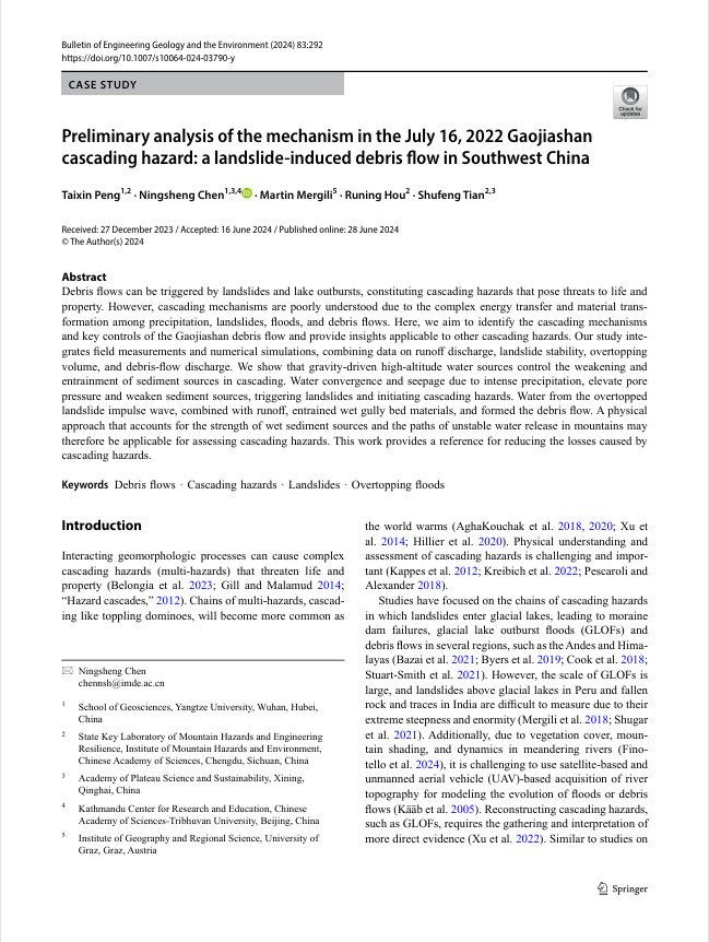 太阳成tyc33455ccwww陈宁生教授团队在《Bulletin of Engineering Geology and the Environment》发表了题为“Preliminary analysis of the mechanism in the July 16, 2022 Gaojiashan cascading hazard: a landslide-induced debris flow in Southwest China”的研究论文。陈宁生教授为通讯作者,太阳成tyc33455ccwww为第一署名单位。本研究获得国家自然科学基金重点研发项目的资助。