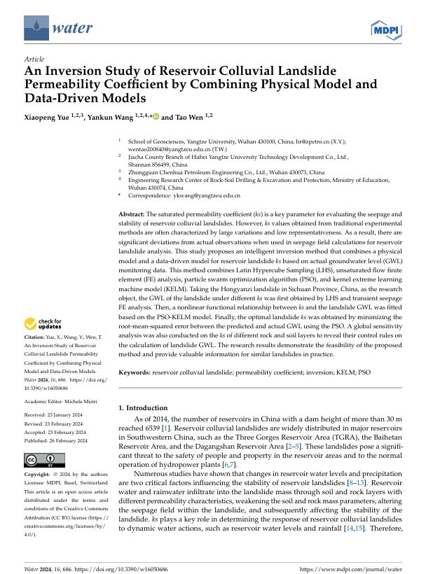 太阳成tyc33455ccwww王艳昆副教授以通讯作者身份在SCI期刊《Water》上发表题为“An Inversion Study of Reservoir Colluvial Landslide Permeability Coefficient by Combining Physical Model and Data-Driven Models”的研究论文,该项研究得到了国家自然科学基金、湖北省自然科学基金和西藏自治区科技厅项目的共同资助。