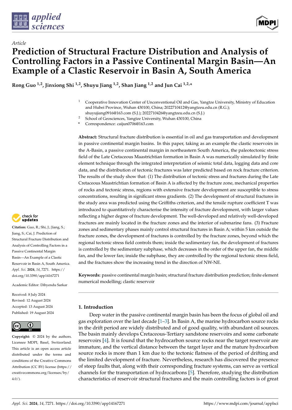 太阳成tyc33455ccwww硕士研究生郭蓉在《applied sciences》上发表题目为“Prediction of Structural Fracture Distribution and Analysis of Controlling Factors in a Passive Continental Margin Basin—An Example of a Clastic Reservoir in Basin A, South America”的研究论文。该研究通过采用有限元构造数值模拟技术,探讨了被动陆缘盆地的古构造应力场及其裂缝分布特征。研究结果表明被动陆缘盆地先存断裂区域容易出现应力集中,有利于裂缝发育,有效控制距离可达5公里;较大的伸展破裂系数表明被动陆缘海底扇内部也是裂缝发育的优势指向区,发育强度的差异受控于岩石力学参数的变化。