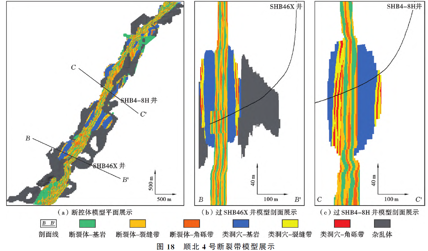 塔里木盆地顺北地区发育断控型碳酸盐岩缝洞储集体,论文以顺北4号断裂带为例,根据发育构造级次划分为走滑断裂带、断控体、断裂体-类洞穴-杂乱体、断裂体-类洞穴内部充填以及微裂缝共5个层级。针对断裂体、类洞穴与杂乱体,采取结构张量、相干能量梯度以及方差地震属性进行表征,完成轮廓模型雕刻;针对断裂体与类洞穴内部充填,设计改进的基于目标的建模方法建立断裂体与类洞穴内部充填结构模型;针对微裂缝,设计改进的离散裂缝网络模型建立符合真实形态的弯曲与共轭微裂缝模型。