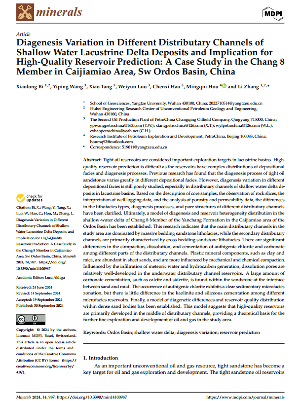 太阳成tyc33455ccwww硕士生毕小龙在张莉副教授的指导下,在期刊《Minerals》上发表题为《Diagenesis Variation in Different Distributary Channels of Shallow Water Lacustrine Delta Deposits and Implication for High-Quality Reservoir Prediction: A Case Study in the Chang 8 Member in Caijiamiao Area, Sw Ordos Basin, China》的研究论文,太阳成tyc33455ccwww为论文第一署名单位,硕士生毕小龙为论文第一作者,其导师张莉副教授为该文通讯作者。