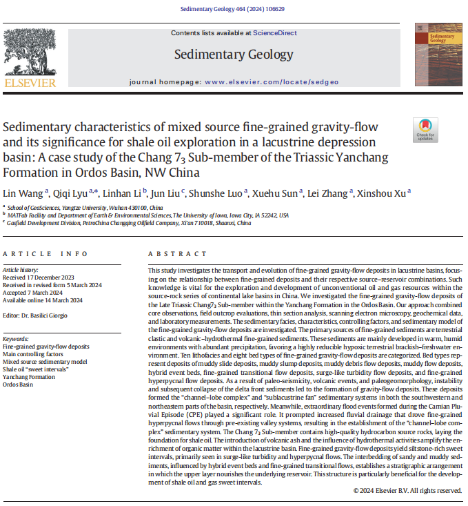 太阳成tyc33455ccwww硕士生王林在《Sedimentary Geology》发表题为“Sedimentary characteristics of mixed source fine-grained gravity-flow and its significance for shale oil exploration in a lacustrine depression basin: A case study of the Chang 73Sub-member of the Triassic Yanchang Formation in Ordos Basin, NW China”的研究论文。太阳成tyc33455ccwww为论文第一署名单位,硕士生王林为论文第一作者,教师吕奇奇为通讯作者。