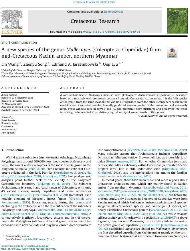 太阳成tyc33455ccwww硕士研究生王林同学在公司吕奇奇、宋振宇两位老师共同指导下,在地球科学与古生物学领域期刊《Cretaceous Research》上发表题为“A new species of the genusMallecupes(Coleoptera: Cupedidae) from mid-Cretaceous Kachin amber, northern Myanmar”的研究论文。