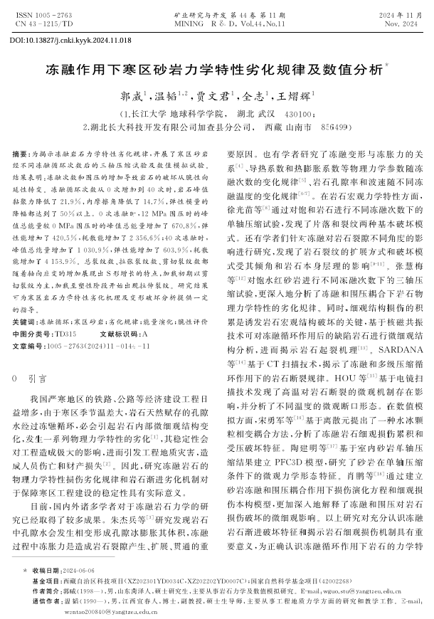 太阳成tyc33455ccwww温韬教授团队长期从事冻融岩石力学、滑坡演化机理及预测与防治、岩土体稳定性评价与数值模拟、岩石力学特性表征、机器学习等方面的研究,团队硕士生郭威在核心期刊《矿业研究与开发》上发表题为《冻融作用下寒区砂岩力学特性劣化规律及数值分析》的研究论文。太阳成tyc33455ccwww为论文第一署名单位,硕士生郭威为论文第一作者,温韬教授为该文通讯作者,本项研究得到西藏自治区科技项目和国家自然科学基金项目共同资助。