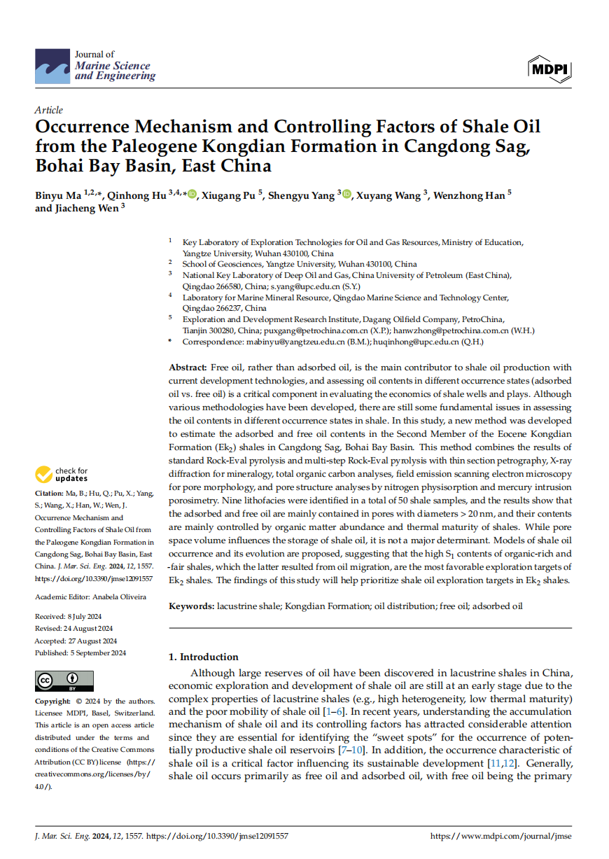 太阳成tyc33455ccwww地质系马斌玉博士以第一作者身份在海洋地质学领域主流期刊《Journal of Marine Science and Engineering》(JMSE)上发表题为“Occurrence Mechanism and Controlling Factors of Shale Oilfrom the Paleogene Kongdian Formation in Cangdong Sag,Bohai Bay Basin, East China”的研究论文,该项研究得到了国家自然科学基金、中国博士后基金和油气资源与勘探技术教育部重点实验室开放基金的资助。