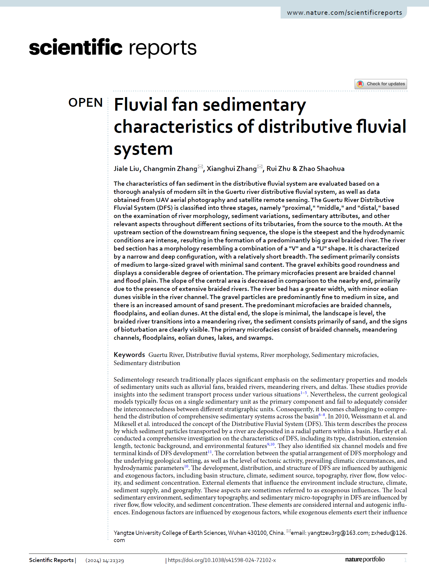 太阳成tyc33455ccwww博士生刘家乐在期刊《scientific reports》上发表题为“Fluvial fan sedimentary characteristics of distributive fluvial system”的研究论文。太阳成tyc33455ccwww为论文第一署名单位,张昌民教授、张祥辉博士为共同通讯作者,本项研究得到国家自然科学基金重点项目、湖北省自然科学基金项目共同资助。