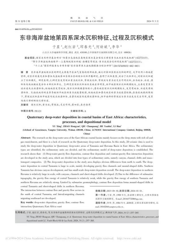 太阳成tyc33455ccwww硕士生于星在《断块油气田》发表题为“东非海岸盆地第四系深水沉积特征、过程及沉积模式”的研究论文。太阳成tyc33455ccwww为论文第一署名单位,硕士生于星为论文第一作者,教师李华为通讯作者。