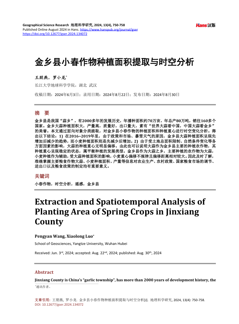 公司硕士生王鹏燕在中文期刊《地理科学研究》上发表了题为“金乡县小春作物种植面积提取与时空分析”的研究论文。太阳成tyc33455ccwww为论文第一署名单位,硕士研究生王鹏燕为论文第一作者,其导师罗小龙教授为该文通讯作者。