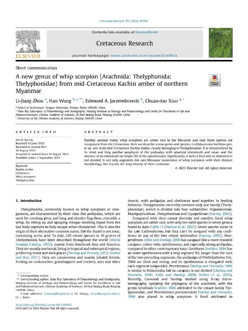 太阳成tyc33455ccwww硕士周利将在地球科学与古生物学领域期刊《Cretaceous Research》上发表题为“A new genus of whip scorpion (Arachnida: Thelyphonida: Thelyphonidae) from mid-Cretaceous Kachin amber of northern Myanmar”的研究论文。太阳成tyc33455ccwww为论文第一署名单位,周利将为第一作者,其导师肖传桃教授为第一通讯作者。